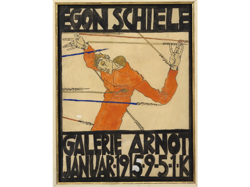 Plakát od Egona Schieleho zvoucího na jeho výstavu je z roku 1915.