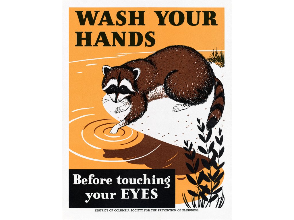 Reprodukce chromolitografie z roku 1941 s nápisem "umývej si ruce, než si budeš sahat do očí."