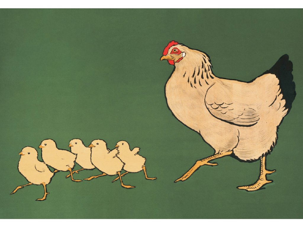 Litografie ve sbírce Národní knihovny Spojených států amerických zobrazuje Slepici a kuřata z roku 1901.