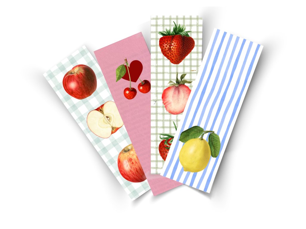 Oboustranné záložky do knihy v setu čtyř kusů, motivy litografií ovoce z let 1880-1917 od amerických botanických ilustrátorů ze sbírky amerického ministerstva zemědělství. Zpracování na tvrdém, kvalitním papíře s nejhezčími detaily a barvami.